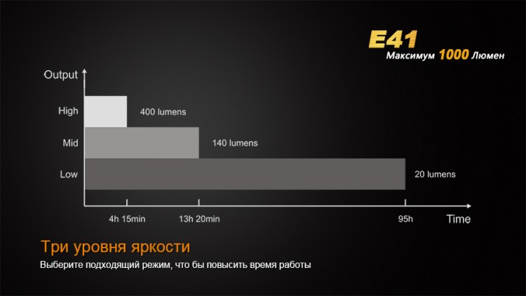 Компактный карманный фонарь Fenix E41 очень производительный. Длина корпуса этой модели составляет всего 116 мм, диаметр ручки - 40 мм, а диаметр головы — 44 мм. При этом фонарь способен производить свет до 1000 люмен в тактическом режиме «Стробоскоп». Обычных уровней яркости у фонаря Fenix E41 три: