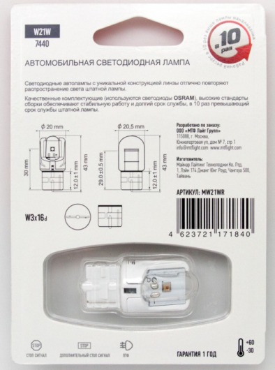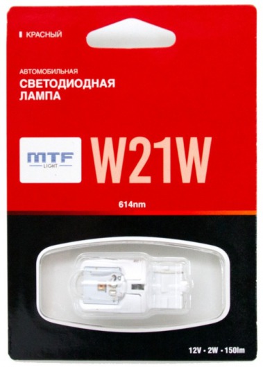 Светодиодная лампа MTF Light W21W 2W с уникальной конструкцией линзы отлично повторяет распространение света штатной лампы. Цвет свечения автолампы: красный.