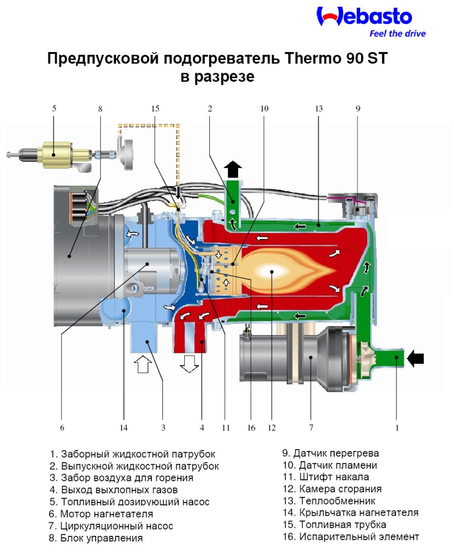 Принцип работы подогревателя основан на разогреве жидкости в сисеме охлаждения двигателя. Жидкость при этом принудительно прокачивается через теплообменную систему Вебасто. Webasto Thermo 90 ST работает автономно, от двигателя автомобиля не зависит. Подключается он к аккумулятору и топливной системе автомобиля.