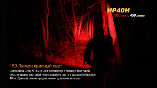 Фонарь Fenix HP40H укомплектован 2 светодиодами: красным Cree XP-E2 яркостью до 150 люмен и белым Cree XP-G2 (R5) яркостью до 450 люмен. Оба полупроводниковых прибора отличаются большой долговечностью и в состоянии проработать 50 000 ч. Несмотря на то, что красный свет менее яркий, его луч лучше сфокусирован, что позволяет освещать территорию радиусом 105 м. Белый светодиод, напротив, дает широкую боковую засветку, создавая удобные условия для туристов, вынужденных шагать в темноте по лесным тропинкам, а также спелеологов, велосипедистов и других потенциальных пользователей данного осветительного устройства.