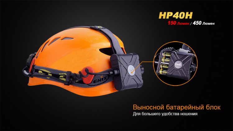 Батарейный блок у Fenix HP40H внешний. Чтобы более равномерно распределить вес устройства на голове, его можно закрепить на эластичных ремешках с затылочной стороны. Отсек для элементов питания, как и головная часть фонаря, хорошо защищен от влаги и выдерживает воздействие любых атмосферных осадков. Корпус Fenix HP40H изготовлен из алюминия и высокопрочного пластика.
