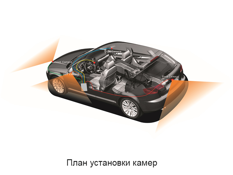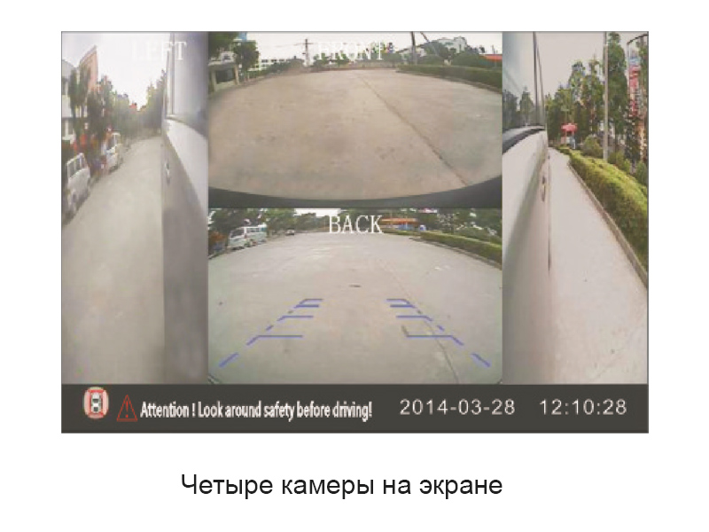 Четырёхканальный видеорегистратор оснащён функцией квадратора: на экране Вы сможете увидеть одновременно картинку со всех камер. В зависимости от маневра, на экран будет выводится изображение с определённой камеры.