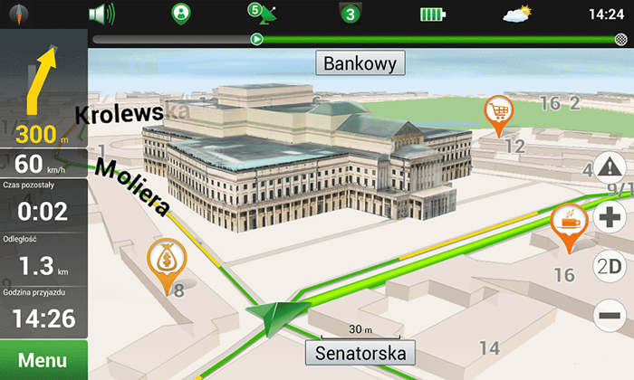 • В процессе движения по маршруту доступен режим голосовых подсказок, которые напомнят о приближающемся повороте, проинформируют о любом отклонении от выбранного маршрута.