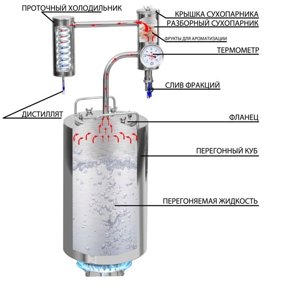 Классический змеевик в проточном холодильнике делает процесс конденсации пара эффективным, и на выходе Вы получаете уже охлажденный продукт.