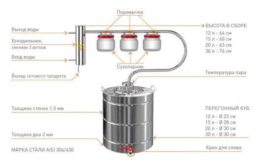 Самогонный аппарат Добрый Жар Луч - модель самогонного аппарата с тремя разборными сухопарниками. Наличие трех сухопарников позволяет получить на выходе чистейший самогон (максимально очищенный от сивушных масел), а за счет того что сухопарники разборные - в них можно заложить различные ингредиенты для ароматизации получаемого продукта.