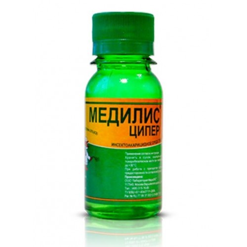 Медилис-ЦИПЕР представляет собой желтоватую прозрачную жидкость, действующим веществом которой является циперметрин. В растворенном в воде виде препарат приобретает белесоватый оттенок.