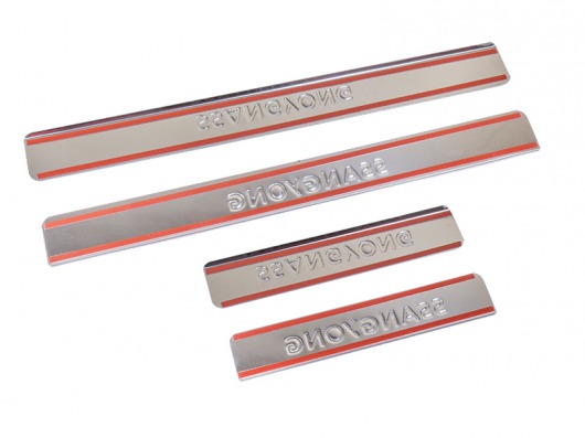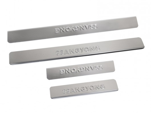 Накладки на металлические пороги дверей Ssang Yong Actyon с логотипом авто не только обеспечивают защиту верхней и боковой поверхности внутреннего порога, но и отлично вписываются в интерьер автомобиля, подчеркивая его стиль и индивидуальность. C монтажом проблем не возникнет: установка накладок на внутренний порог для Санг Енг Актион производится на штатные места с помощью скотча 3M.