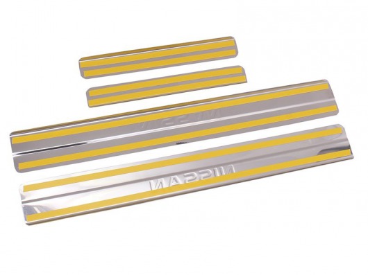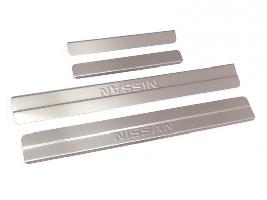 Накладки на металлические пороги дверей Ниссан Альмера с логотипом авто не только обеспечивают защиту верхней и боковой поверхности внутреннего порога, но и отлично вписываются в интерьер автомобиля, подчеркивая его стиль и индивидуальность. C монтажом проблем не возникнет: установка накладок на внутренний порог для Nissan Almera производится на штатные места с помощью скотча 3M.