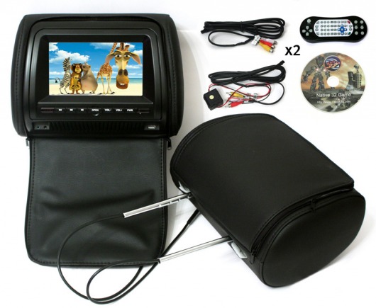 Для установки подголовников Вам нужно отрегулировать расстояние между металлическими ножками в пределах от 11 до 20 сантиметров и подобрать уплотнительные втулки подходящего диаметра. Последние есть в комплекте поставки.  Кроме этого, с подголовниками Вы получите диск на 300 игр с проводным джойстиком, что точно обрадует Ваших маленьких пассажиров.