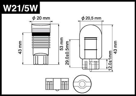W21/5W двухконтактная. Используется для габаритных огней и стоп сигнала. Когда Вы подаете питание, промежуток времени с этого момента и до пика свечения у этой модели мгновенный. Это особенно важно в критических ситуациях, так как водитель сзади может быстрее среагировать на Ваш сигнал.