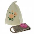 Набор для бани "Роза" из 3 предметов: шапочки, мыла и мочалки.
