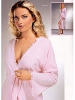 Длинная модель с роскошными кружевами в области декольте и на рукавах, атласная лента обрамляет полы халата и пояс.