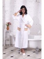 Изысканный женский халат класса Люкс из нежной махровой ткани с добавлением бамбука. Халат с воротником - шалькой, с длинными, слегка расклешенными к низу рукавами. Декоративный кант украшает воротник и полы халата, а манжеты рукава и верхняя часть кармана - украшены кружевами золотистого цвета.
