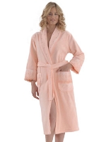 Женский вафельный халат класса Люкс. Отделка нежным хлопковым кружевом по капюшону, передним полам халата, по нижней части и на манжетах рукава. Удобный рукав - 3/4. Внутренние карманы. Укороченный вариант - чуть выше колена.